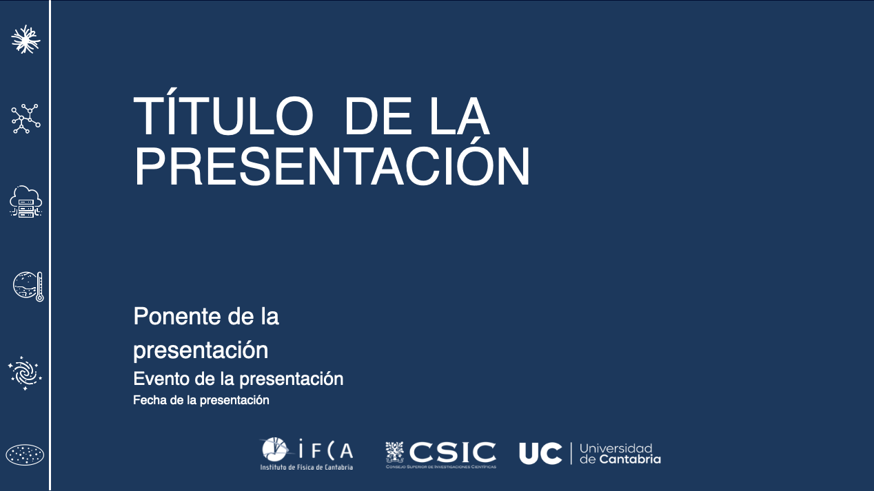 Descarga aquí el manual de identidad corporativa del IFCA, en el enlace se podrán encontrar los nuevos logos del 30 aniversario del centro, las plantillas para las presentaciones, los manuales de identidad corporativa del CSIC y la UC, fondos para reuniones telemáticas, tarjetas de visita, etc.